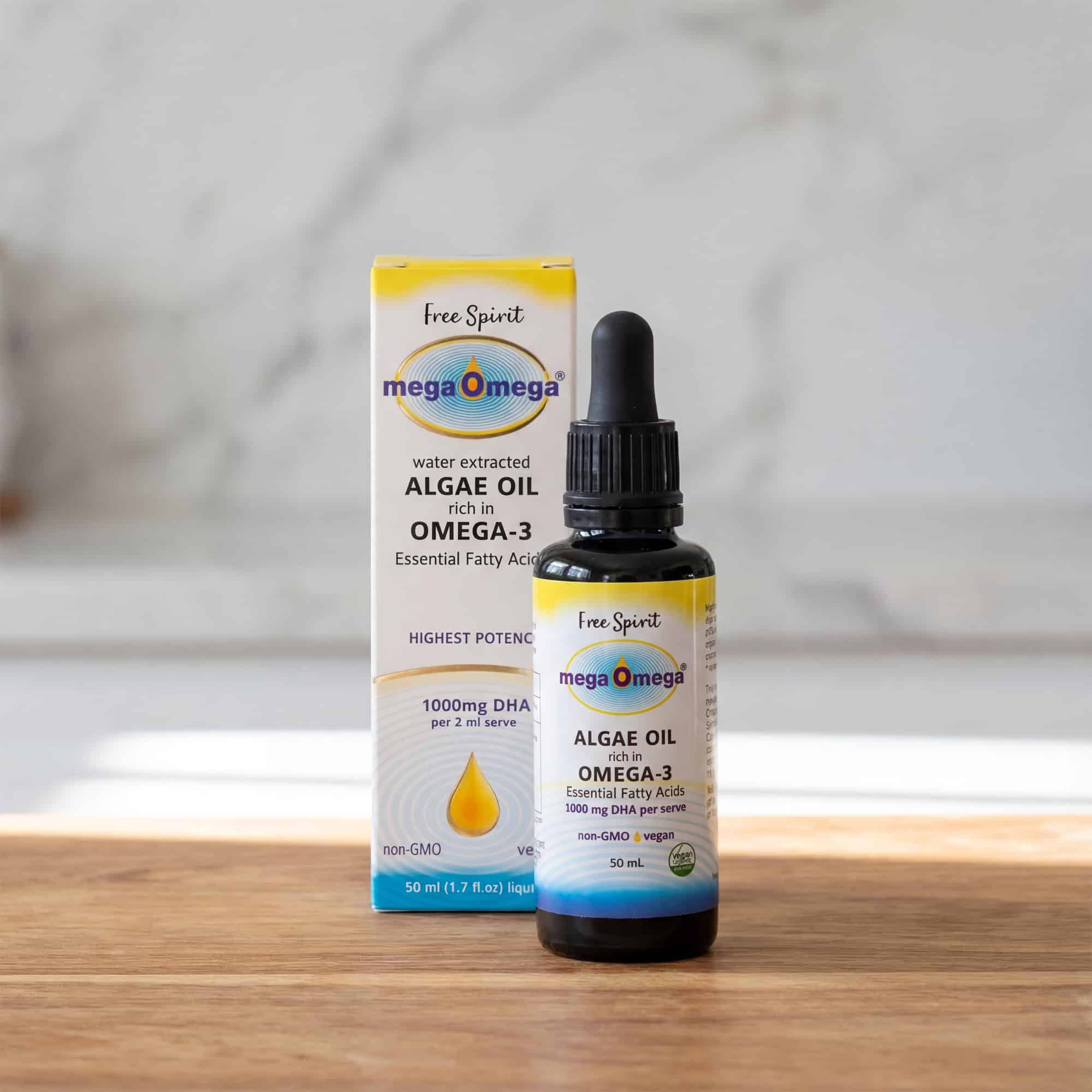 megaOmega® vegan algal oil. Ethically sourced, entirely organic and natural plant based omega-3’s. Water extracted from wild strain non-modified Chromista Schizochytrium sp. The highest natural concentration of DHA known on earth, providing 1000mg DHA/10mg EPA per serve.